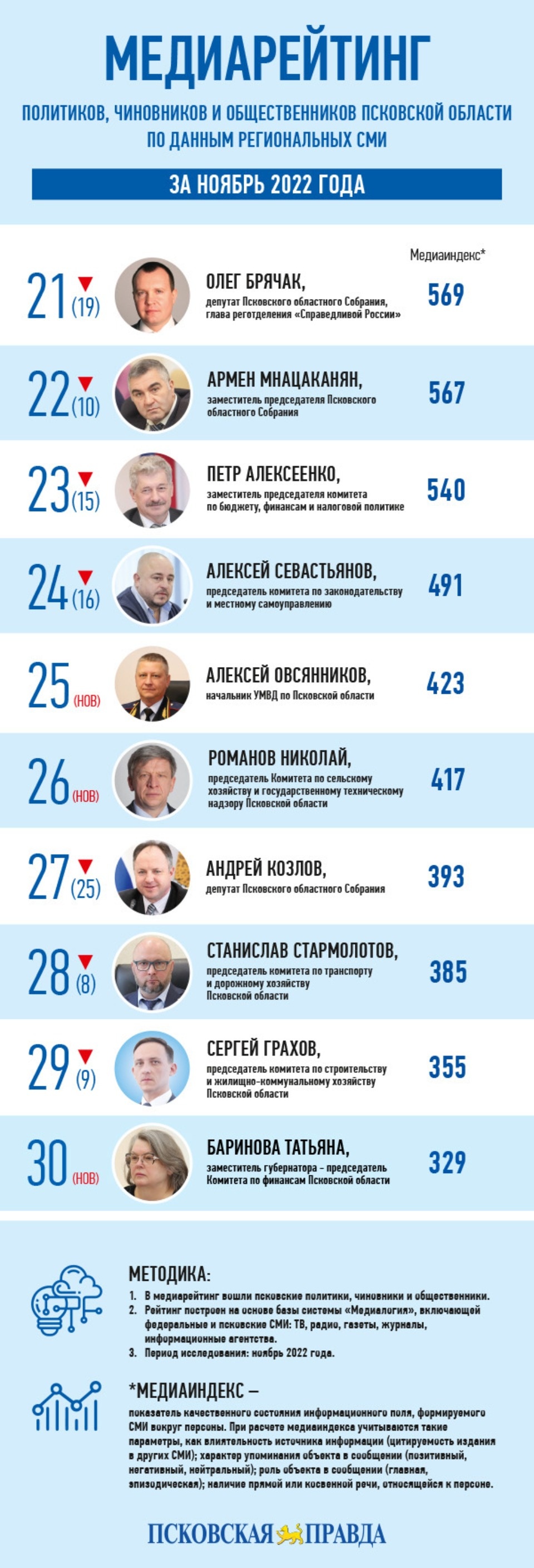 Из лидеров реготделений оппозиционных партий в ноябрьский топ-30 вошли только вождь псковских справедливороссов Олег Брячак (21-е место, медиаиндекс 569) и первый секретарь обкома КПРФ Петр Алексеенко (23-е место, медиаиндекс 540).