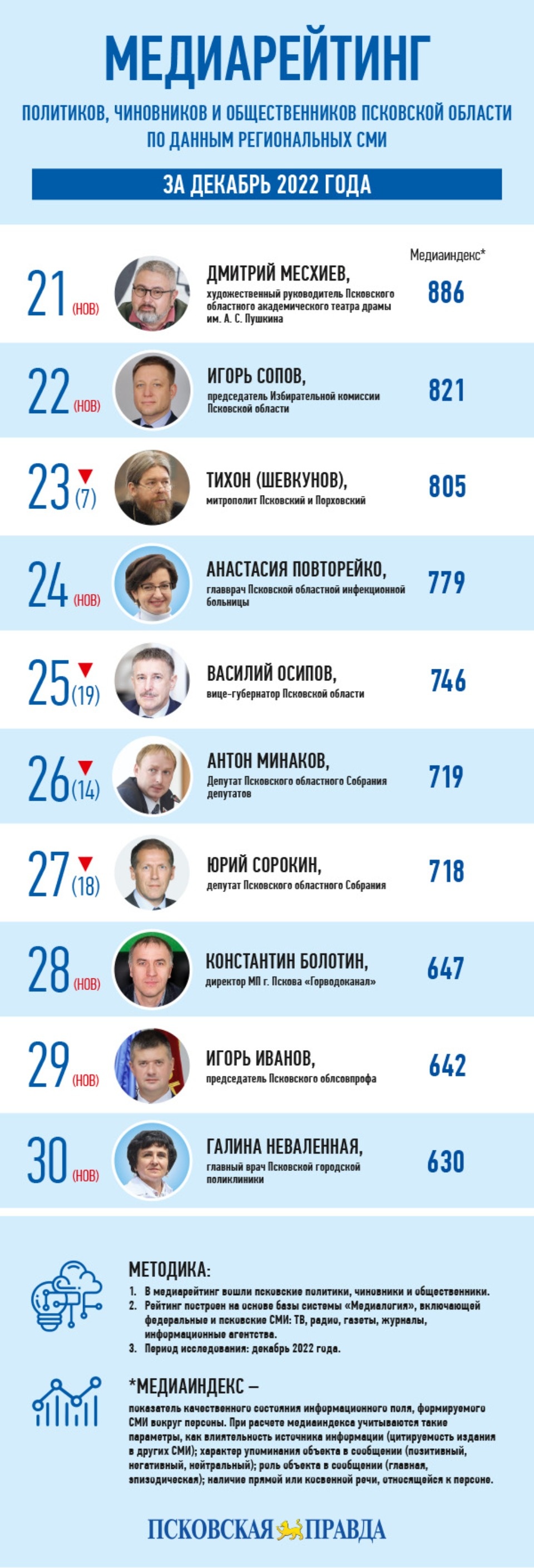 Также в топ-30 вернулись директор псковского драмтеатра Дмитрий Месхиев (21-е место, медиаиндекс 886), который перед новым годом был нарасхват у СМИ, и глава региональной избирательной комиссии Игорь Сопов (22-е место, медиаиндекс 821), активно упоминавшийся, в частности, в связи с досрочными выборами главы Пушкиногорского района.