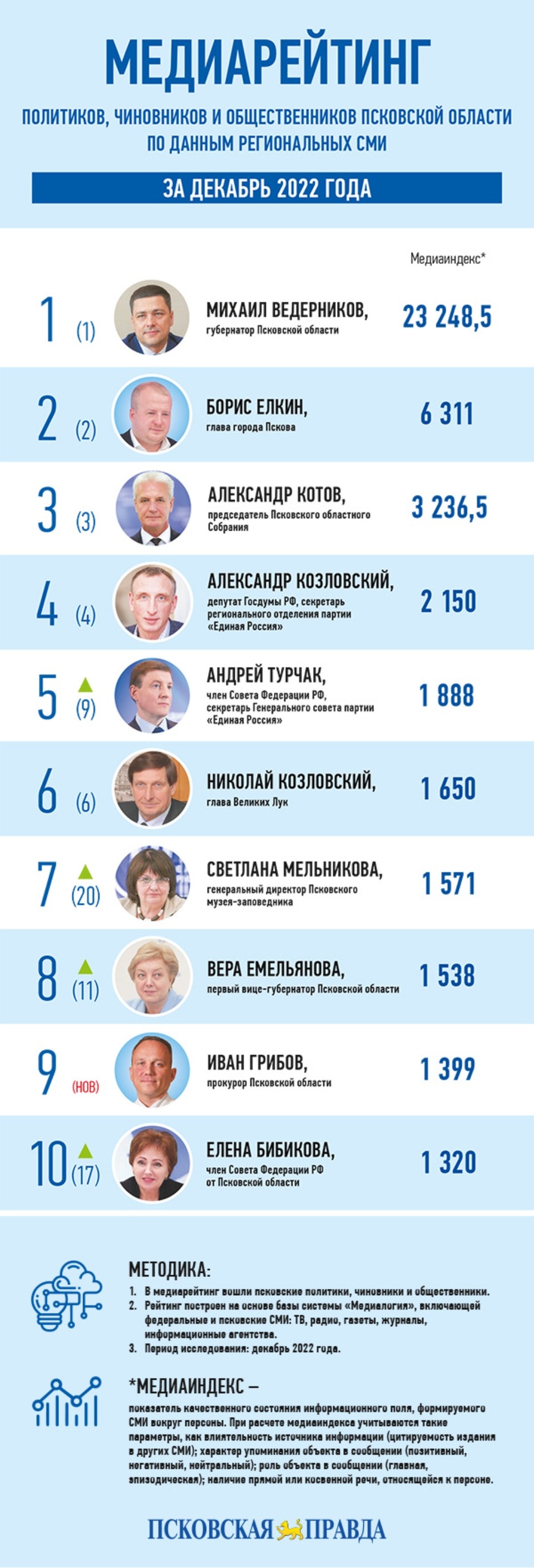 Последний месяц 2022 года стал особенно продуктивным с точки зрения роста медийности для губернатора Псковской области. И можно предположить, что в новом, выборном 2023 году эта тенденция сохранится. Что еще нового принес декабрь - в традиционном обзоре «Псковской правды», построенном на анализе медиарейтинга региональных политиков, чиновников и общественников.