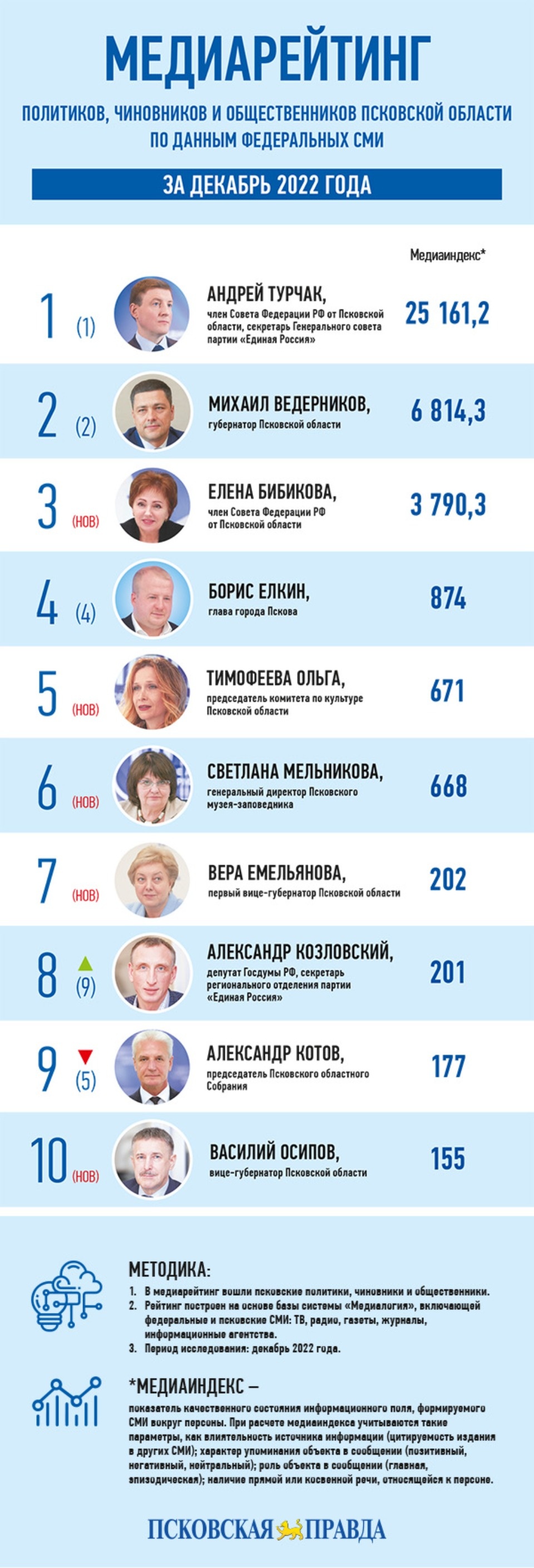 Медиаиндекс вырос и у члена Совета Федерации от Псковской области, секретаря Генсовета «Единой России» Андрея Турчака (5-е место, медиаиндекс 1 888). Большая часть сюжетов с его участием касалась инициатив федеральной «ЕР» и личной политической активности сенатора, связанной со специальной военной операцией (в декабре он в частности возглавил созданную по инициативе президента парламентскую координационную группу по вопросам СВО). Тем не менее, в числе значимых с точки зрения медийности историй для Андрея Турчака оказались упоминание в бюджетном послании Андрея Турчака и участие в псковской благотворительной «ёлке желаний».