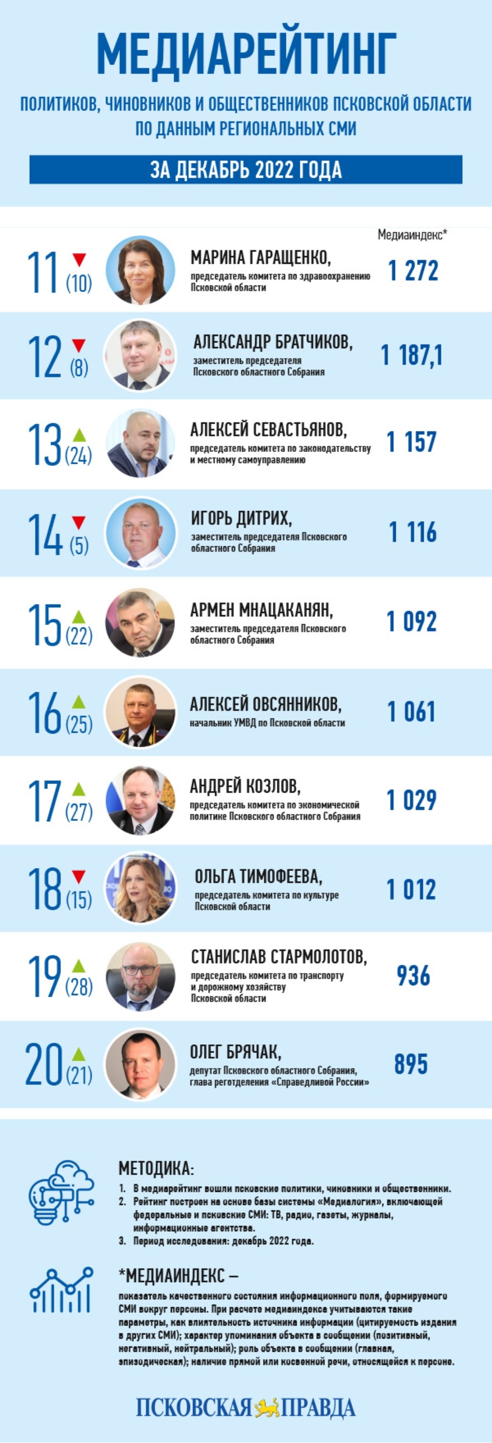 «Акции вверх» по итогам декабря у начальника УМВД по Псковской области Алексея Овсянникова (16-е место, +9 пунктов, медиаиндекс 1 061) и председателя областного комитета по транспорту и дорожному строительству Станислава Стармолотова (19-е место, +9 пунктов, медиаиндекс 936). Стоит ли говорить, что оба руководителя подводили итоги года в формате пресс-конференции в медиацентре ПАИ?