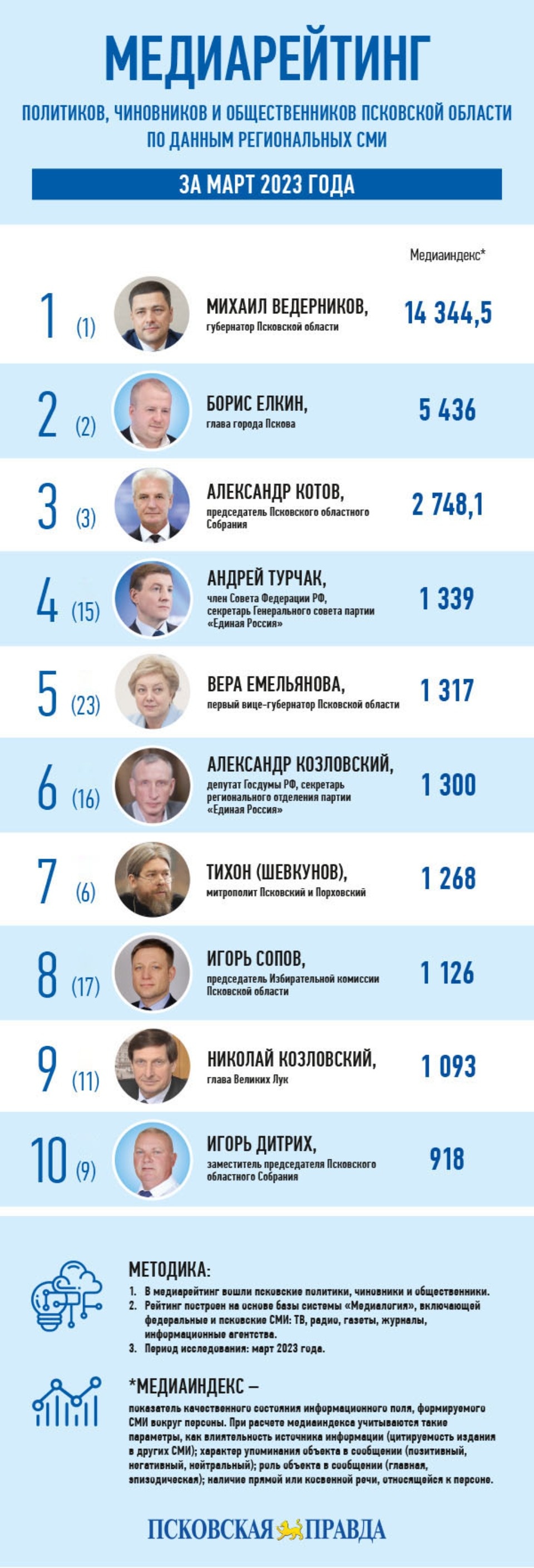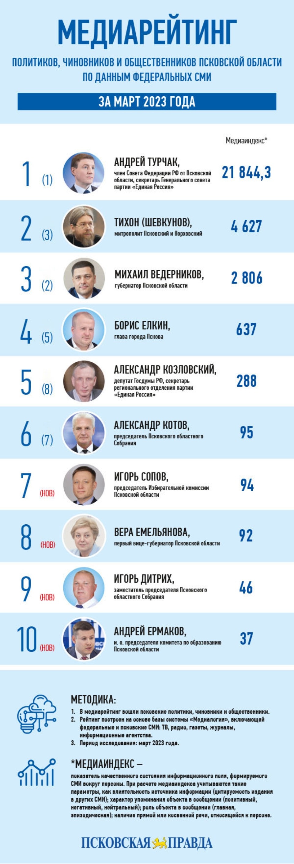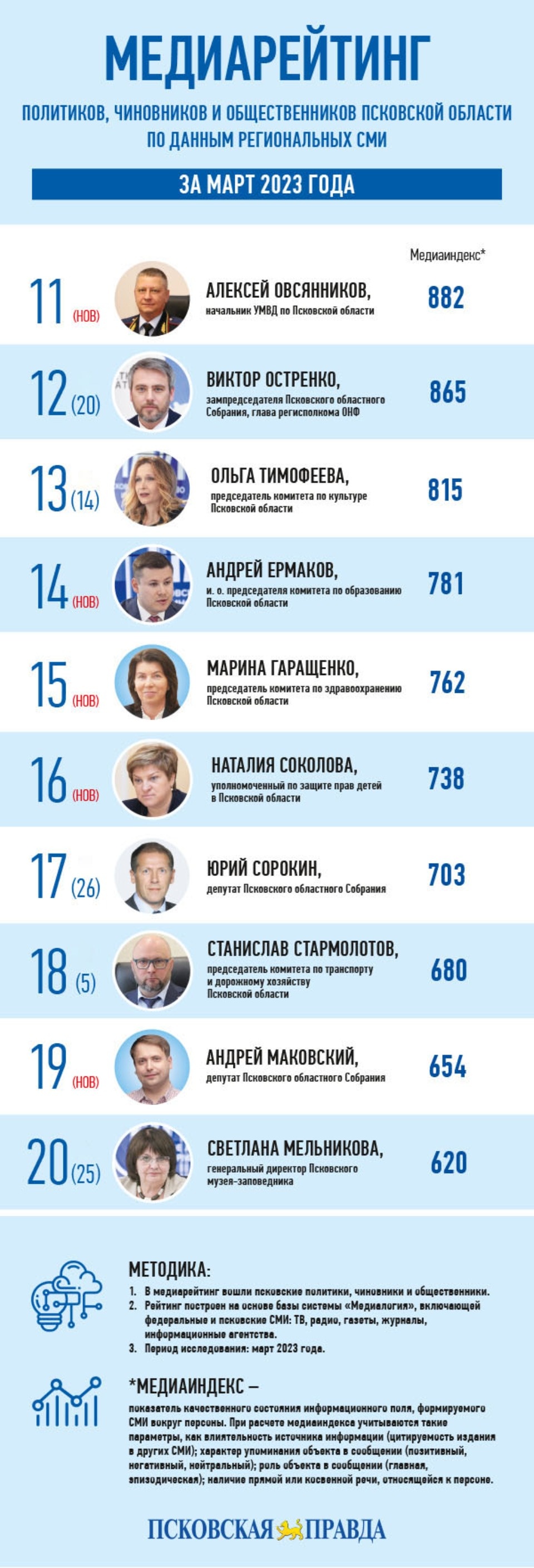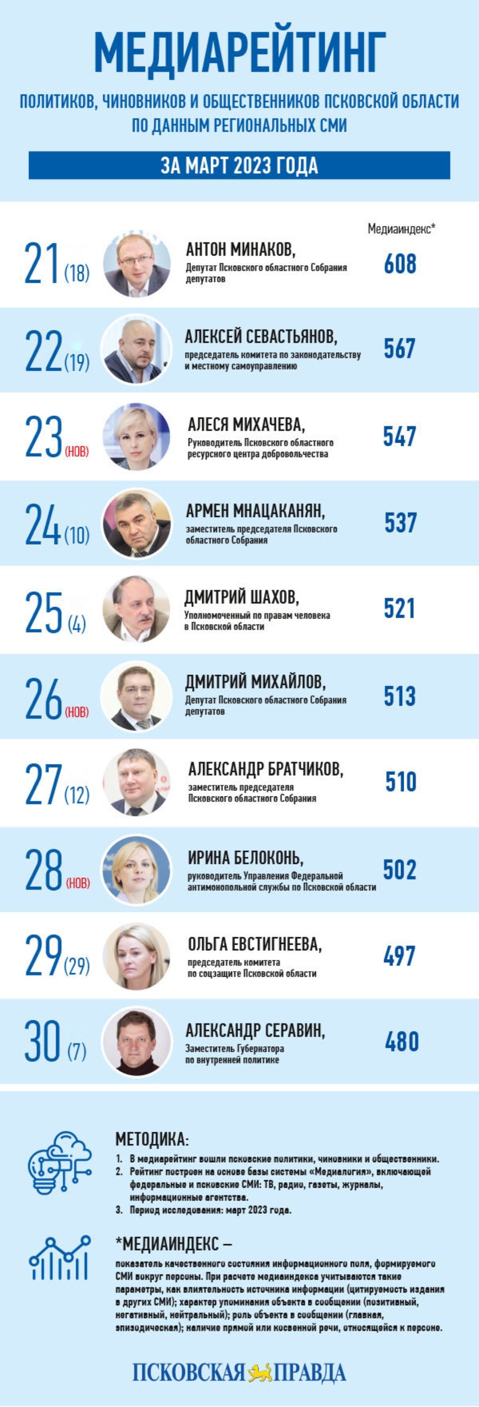 Из числа «сверхновых» людей в мартовском медиарейтинге фигурируют две персоны. Это, во-первых, руководитель регионального управления Федеральной антимонопольной службы по Псковской области Ирина Белоконь (28-е место, медиаиндекс 502). Главой псковского УФАС она стала с 1 ноября 2022 года. А в марте наконец нарушила «обет молчания» и приняла участие в пресс-конференции в медиацентре Псковского агентства информации, а также дала сразу несколько интервью СМИ региона.Также в топ-30 впервые вошел секретарь обкома КПРФ, член фракции компартии в региональном парламенте Дмитрий Михайлов (26-е место, медиаиндекс 513). В марте он был активен в СМИ, регулярно упоминаясь в контексте грядущих выборов и празднования 30-летия воссоздания компартии в РФ.