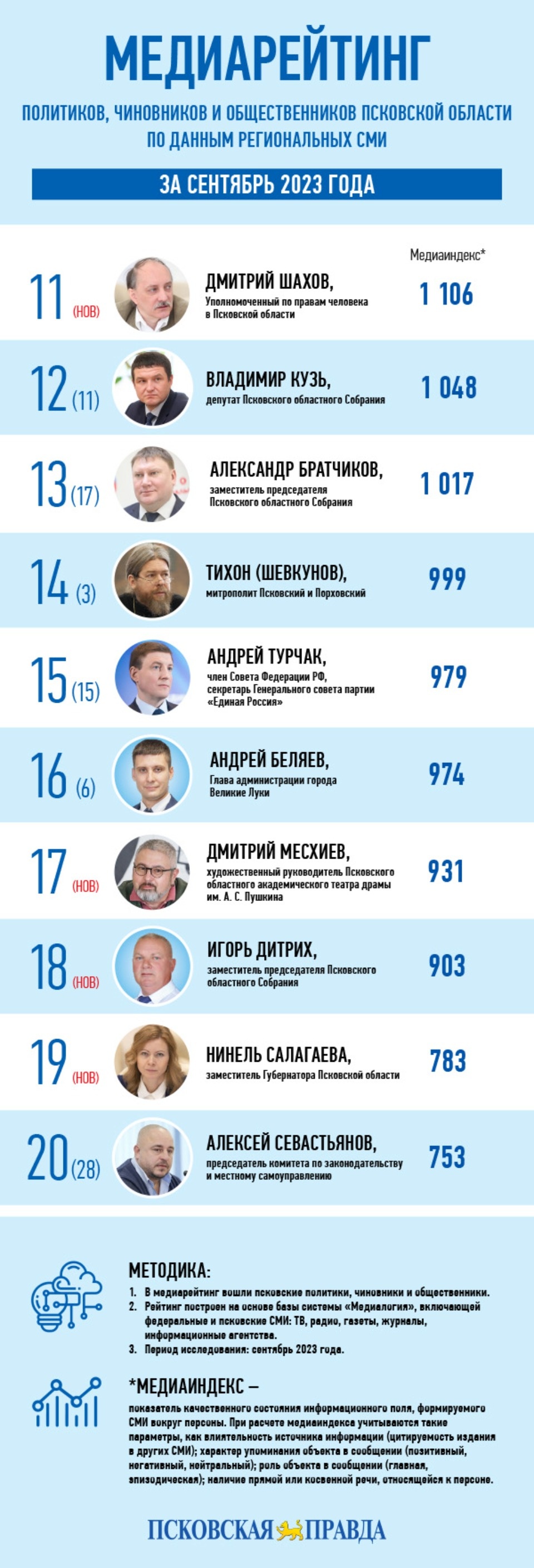 Директор и и худрук псковского драмтеатра Дмитрий Месхиев в региональном медиарейтинге занял 17-е место с медиаиндексом 931: в сентябре он много рассказывал о старте нового театрального сезона. Кроме того, в первом месяце осени в Пскове стартовал Пушкинский театральный фестиваль.По соседству с известным режиссером в рейтинге расположились вице-спикер областного Собрания Игорь Дитрих (18-е место, медиаиндекс 903) и вице-губернатор Нинель Салагаева (19-е место, медиаиндекс 783). Первый попаданием в региональный медиарейтинг обязан активной работе по подготовке и проведению сентябрьской сессии регионального парламента. Вторая – рабочим встречам с губернатором, на которых обсуждалось развитие авиасообщения из Пскова и ситуация в региональном АПК.