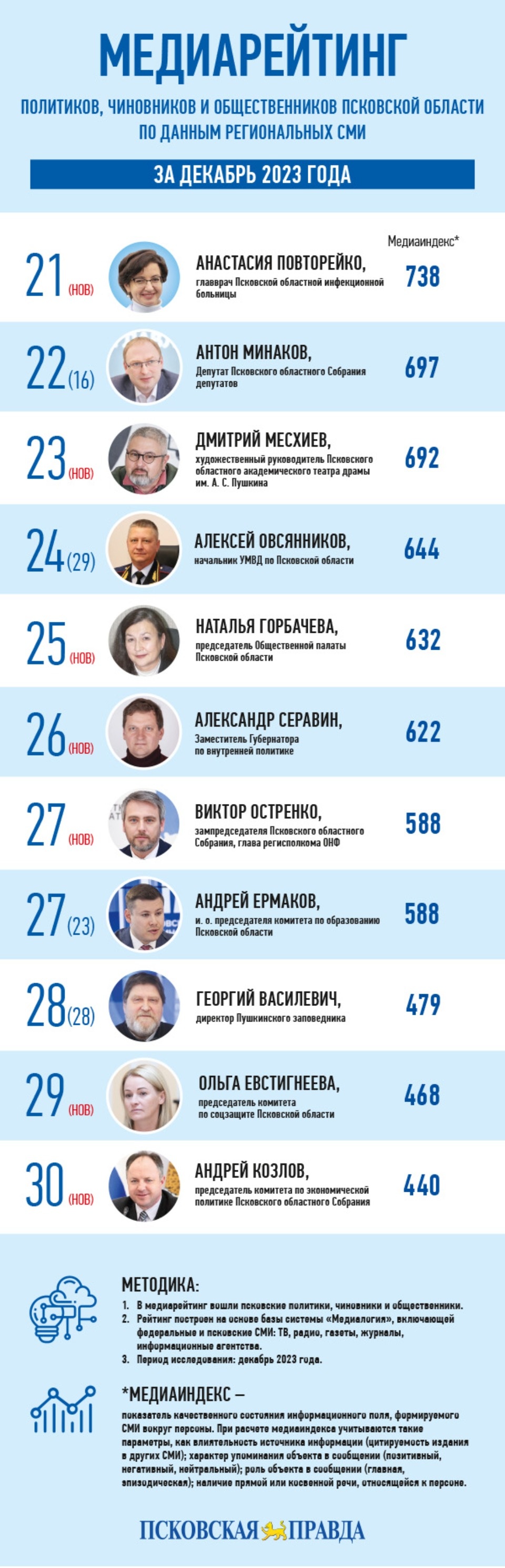 Глава областной соцзащиты в топ попала в связи с обсуждением региональными депутатами создания Социального информационно-аналитического центра рассмотрел профильный комитет Собрания вопроса о создании в Псковской области Социального информационно-аналитического центра и законопроекта о запрещении склонения к искусственному прерыванию беременности.Резюмируя, отметим попадание в топ-30 директора и художественного руководителя Псковского академического театра драмы им. А. С. Пушкина, известного кинорежиссера Дмитрия Месхиева (23-е место, медиаиндекс 692). В декабре он при поддержке Президентского фонда культурных инициатив провел в Пскове Фестиваль китайской культуры «Мо Янь фест».