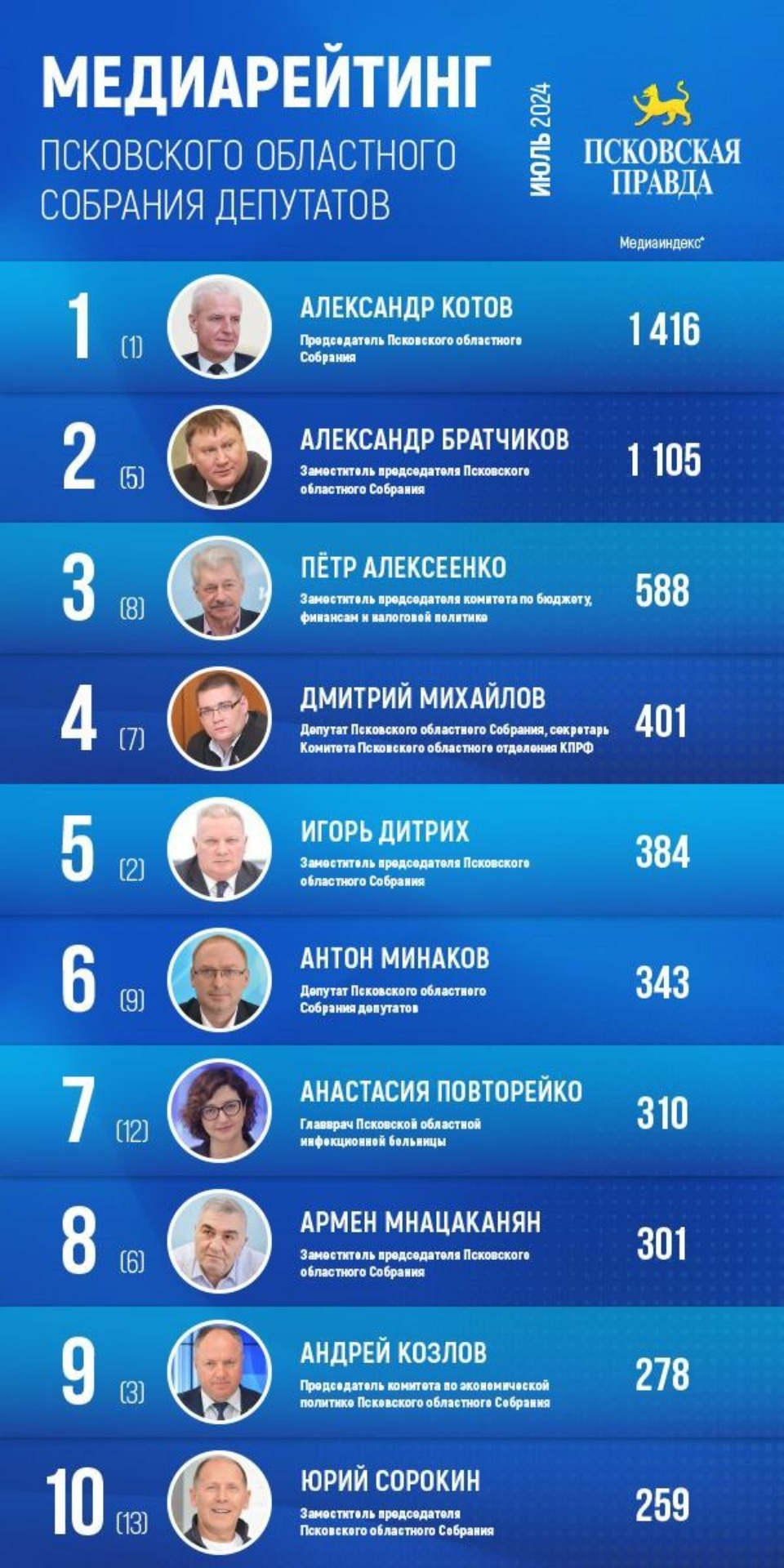Не можем не отметить рост в медиарейтинге сразу на пять строчек члена фракции «ЕР» Анастасии Повторейко (7-е место, медиаиндекс 310). Впрочем, в основном это было связано с ее профессиональной деятельностью: в июле в Псковской областной инфекционной больнице, главным врачом которого является Анастасия Повторейко, запустили проект по ведению пациентов с ВИЧ. Кроме того, медик предложила создать в регионе специальный совет по поддержке семей и приняла участие в первой конференции областной «Медицинской палаты».