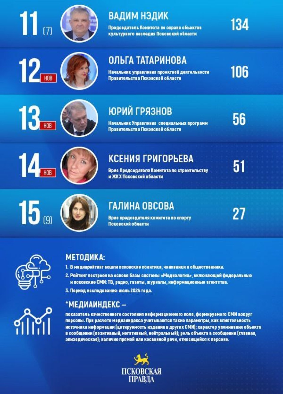 Добавим, что в топ-15 сразу четыре новых лица. Во-первых, в рейтинг вернулся избавившийся в июле от приставки «врио» руководитель аппарата правительства Андрей Вьюнов (9-е место, медиаиндекс 284). Также в список медийных лидеров впервые вошли начальник управления проектной деятельности правительства Псковской области Ольга Татаринова (12-е место, медиаиндекс 106), начальник управления специальных программ Правительства Псковской области Юрий Грязнов (13-е место, медиаиндекс 56) и временно исполняющая обязанности председателя комитета по строительству и ЖКХ Псковской области Ксения Григорьева (14-е место, медиаиндекс 51).