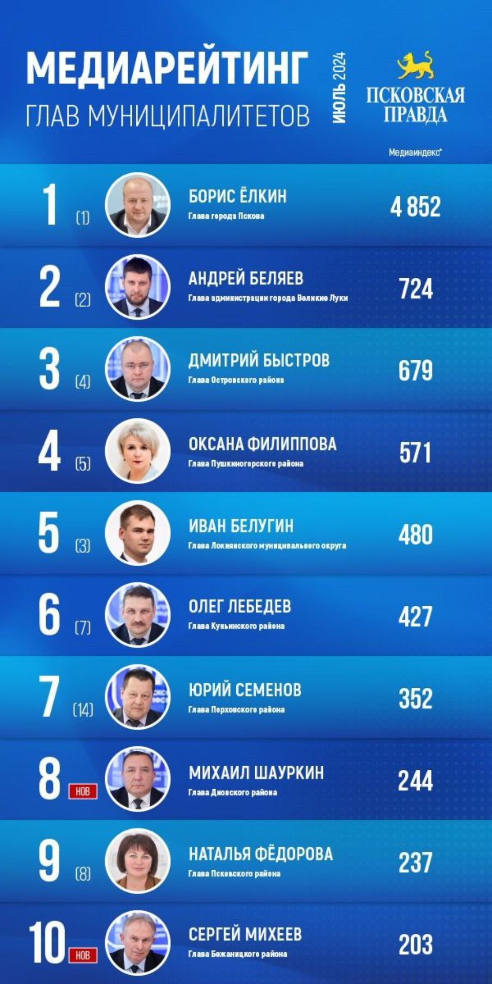 Также в топ-15 сразу пять новичков: это глава Дновского района Михаил Шауркин (8-е место, медиаиндекс 244), глава Бежаницкого района Сергей Михеев (10-е место, медиаиндекс 203), глава Палкинского района Ольга Потапова (11-е место, медиаиндекс 202), глава Плюсского района Наталья Иванова (12-е место, медиаиндекс 193) и глава Себежского района Леонид Курсенков (13-е место, медиаиндекс 171).