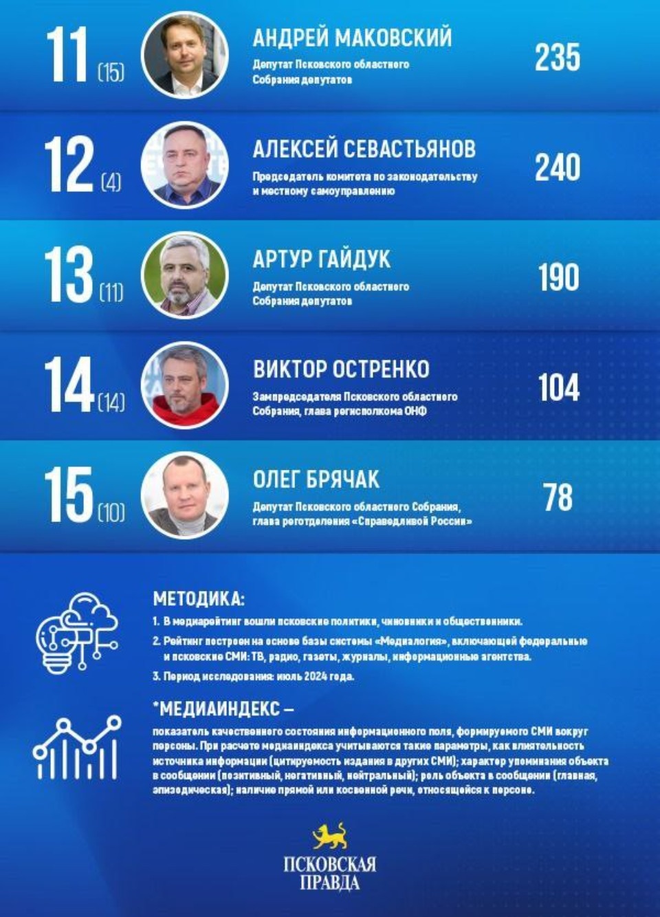 Медиарейтинги «Псковской правды» построены на основе анализа СМИ Псковской области. Персоны в них ранжированы по размеру медиаиндекса: показателя качественного состояния информационного поля, рассчитанного системой «Медиалогия» с учетом влиятельности источника информации, характера упоминания и роли объекта в сообщении, а также наличия прямой или косвенной речи, относящейся к персоне.