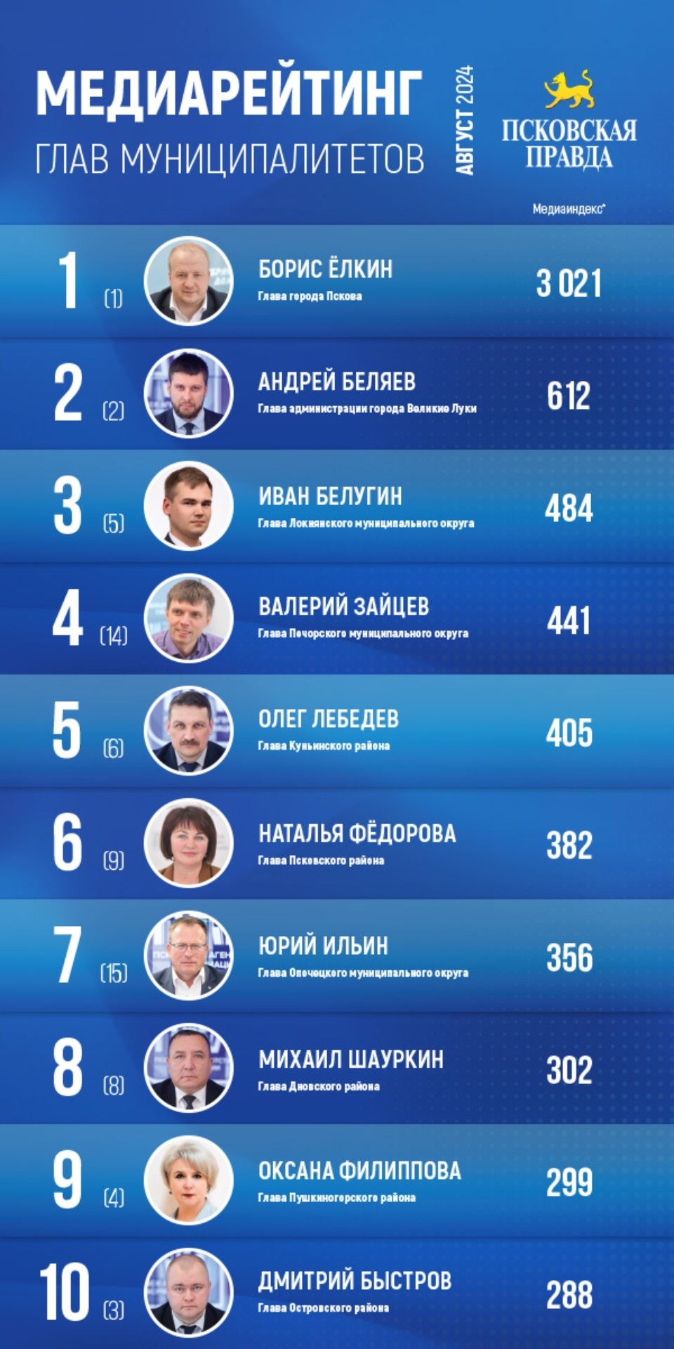 Самый значительный рост в медиарейтинге продемонстрировал глава Печорского муниципального округа Валерий Зайцев (4-е место, медиаиндекс 441): он поднялся сразу на десять позиций. В Печорах в августе отмечали День города, 80-ю годовщину освобождения района от немецко-фашистских захватчиков, а также престольный праздник «градообразующего» для муниципалитета Псково-Печерского монастыря.