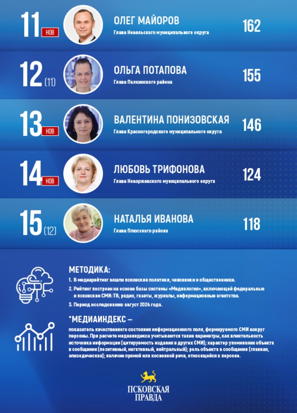 На восемь строчек в топе выросли позиции главы Опочецкого района Юрия Ильина (7-е место, медиаиндекс 356). Он принимал участие в Форуме регионов Северо-Запада России в Калининграде вместе с главой Красногородского муниципального округа, председателем ассоциации «Совет муниципальных образований Псковской области» Валентиной Понизовской (13-е место, медиаиндекс 146), которая в наш топ-15 вошла впервые.