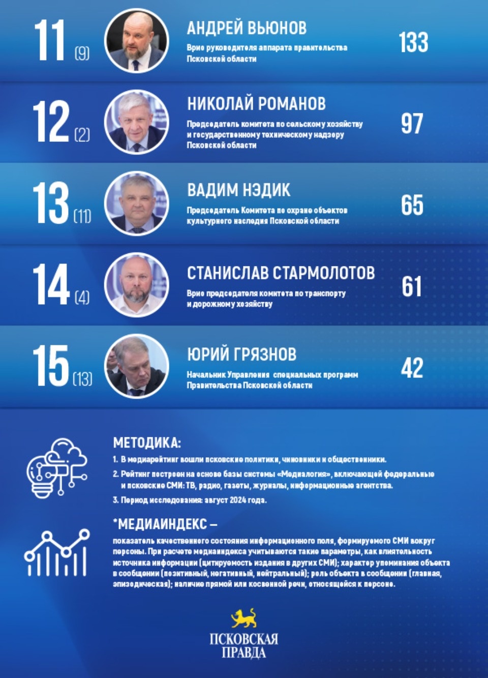 Медиарейтинги «Псковской правды» построены на основе анализа СМИ Псковской области. Персоны в них ранжированы по размеру медиаиндекса: показателя качественного состояния информационного поля, рассчитанного системой «Медиалогия» с учетом влиятельности источника информации, характера упоминания и роли объекта в сообщении, а также наличия прямой или косвенной речи, относящейся к персоне.