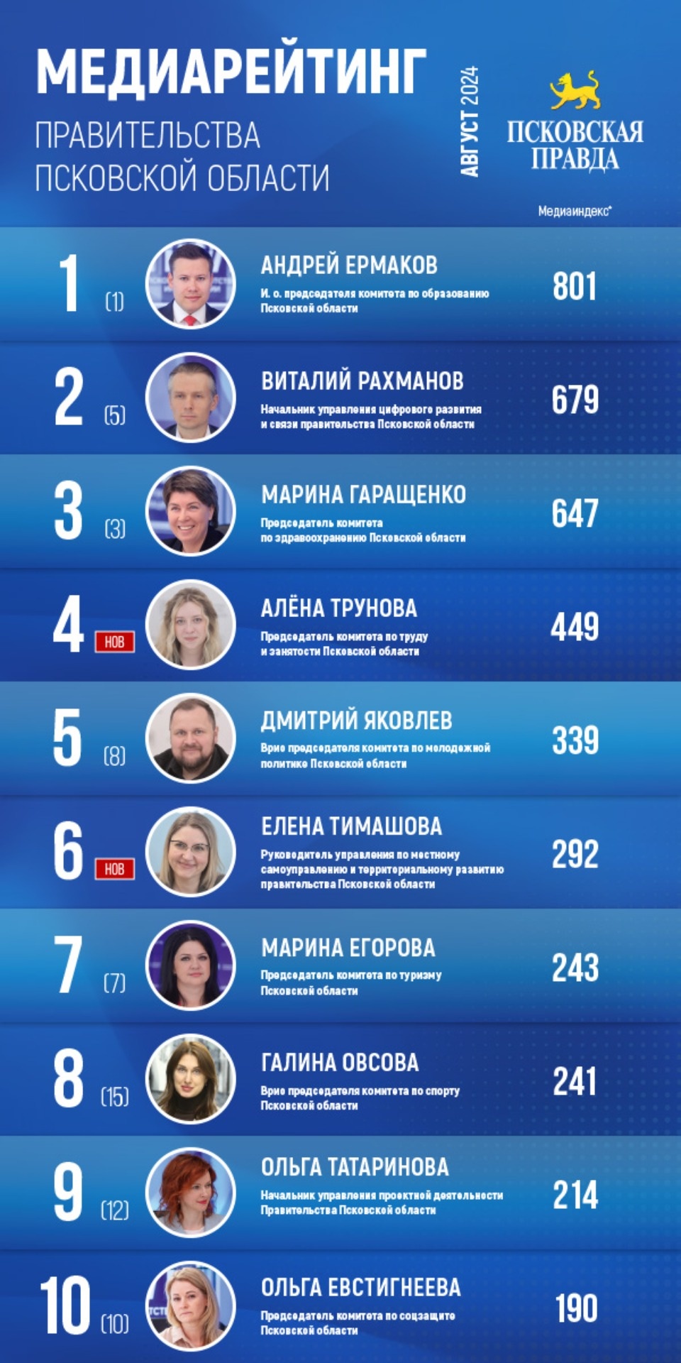 Самый значительный рост позиций среди псковских чиновников, – на семь строчек, – в августе продемонстрировала врио председателя комитета по спорту Псковской области Галина Овсова (8-е место, медиаиндекс 241). В этом месяце она участвовала в открытии Межрегионального спортивного фестиваля Всероссийского общества инвалидов и Всероссийского спортивного марафона «Сила России», подписывала меморандум о взаимодействии в сфере спорта между Псковской и Витебской областями, а также сопровождала заместителя министра спорта и туризма Белоруссии Олега Андрейчика, который посетил псковский стадион «Машиностроитель».