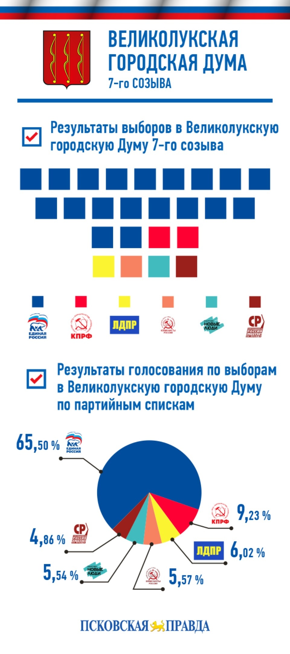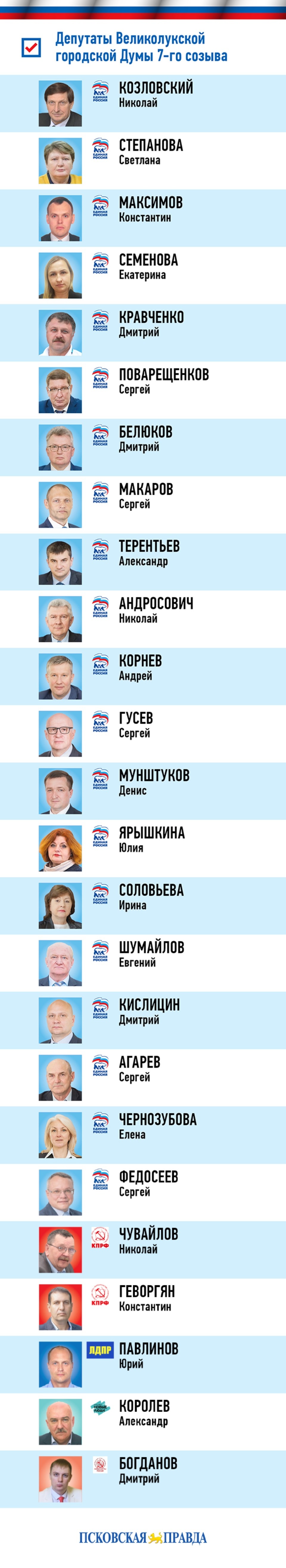 21 сентября Территориальная избирательная комиссия Великих Лук официально опубликовала постановления о регистрации депутатов Великолукской городской Думы 7-го созыва, избранных 11 сентября. «Псковская правда» подготовила инфографику, посвященную партийным раскладам нового созыва и его персональному составу.