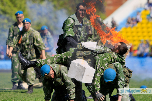 На футбольном поле десантники демонстрировали свои боевые навыки. То доски кулаком разобьют, то в рукопашную пойдут, то заложника освободят, то боевых собак на поле выведут. И все это под дымовой завесой и под звук канонады из автоматов и гаубиц. Время от времени автоматные очереди прерывались музыкальной паузой: «Теперь я в ВДВ служу, ей-богу, братцы, не тужу» – пели солисты ансамбля «Голубые молнии».