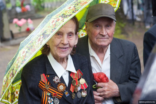 В Пустошке местных жителей не испугали даже пронизывающий ветер и сильный ливень.На торжества приходили и целыми семьями, и вместе с коллегами. Надежда Матвеева приехала из деревни Сергейцево, что в 15 километрах от Пустошки. Надежда Ильинична родилась в октябре 41-го и о войне знает больше по маминым рассказам, но отрывочные воспоминания сохранила и цепкая детская память. Как мама прятала четверых детей по кустам, как рядом с домом было несколько огромных воронок.