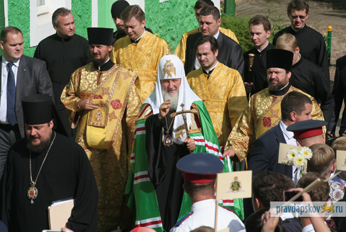 В Пскове Патриарх Кирилл обратился к прихожанам с кафедры Троицкого собора. Трансляцию смогли услышать все собравшиеся у храма прихожане. Всем верующим были переданы изображения Сергия Радонежского с патриаршим благословением.