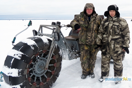 Среди лавины самой разнообразной и довольно шумной японо-китайской техники на льду встречаются редкие, но яркие самодельные конструкции. Такие экземпляры выделяются оригинальностью дизайна, а главное – безопасностью при передвижении по снегу и льду. Напоминают они неуклюжие трехколесные мотоциклы с высоким рулем и огромными колесами или большое насекомое, уверенно передвигающееся во всех направлениях и в любых условиях. Рыболовы прозвали их «каракатицами» – за устойчивость, вездеходность и способность не утонуть в полынье. Много их повидал, но та, которая повстречалась мне 10 января в 10 км от берега, явно выделялась среди своих собратьев – и статью, и размерами, и пассажировместимостью. Не удержался, отложил в сторону удочки (все равно не клевало), подошел к трехногому богатырю. Рядом рыбачили и хозяева «каракатицы». Познакомились – два псковича, два Андрея. Постарше (он же – и главный конструктор, и инженер, и механик – из скромности попросил не называть свою фамилию) о своем детище особенно много не говорил.