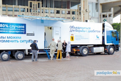 «Мобильный диабет-центр» – масштабный научно-практический просветительский проект, который осуществляется крупной фармацевтической компанией совместно с Министерством здравоохранения и социального развития РФ и Эндокринологическим научным центром. В Псковской области экспресс-обследование проводится при поддержке Государственного комитета по здравоохранению и фармации.