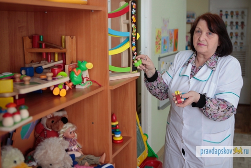 Чтобы помочь малышам преодолеть проблемы, в Доме ребенка работает целая команда специалистов во главе с опытными докторами. Дважды в год для углубленного медицинского осмотра ребят приезжает бригада врачей-специалистов из консультативной поликлиники Псковской детской областной больницы. Работа не прекращается ни на минуту даже в группах, где с детьми занимаются воспитатели и медицинские сестры, логопеды и психолог. Имеется кабинет для массажа, физиопроцедурный кабинет, музыкальный и спортивный залы, комната психологической адаптации воспитанников, сенсорный комплекс с комнатой световых эффектов.