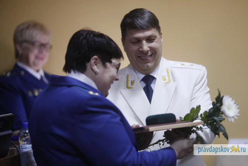 День сотрудника органов прокуратуры стал поводом для присвоения внеочередных классных чинов, вручения ведомственных и государственных наград, благодарностей и ценных подарков особо отличившимся сотрудникам надзорного ведомства. Перед их чествованием прокурор Псковской области Сергей Белов напомнил, что неспроста символом прокуратуры является столп закона: