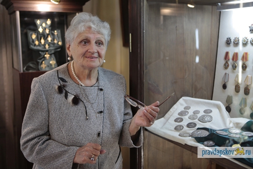 В 1966 году 31 августа выпало на среду. Этот день стал первым рабочим днем для выпускницы филфака ЛГУ Саши Григорьевой. В Псков она приехала к мужу-телевизионщику, в музей устроилась на место сотрудницы, ушедшей в декрет. Думала поработать годик. И вот уже 50 лет Александра Сергеевна отдала науке. 27 из них она являлась главным хранителем музея, а сейчас занимается нумизматикой.Нас встречают в Доме Масона, где организовано открытое хранение фондовых коллекций (в том числе «Золотой кладовой», главной псковской сокровищницы, хранящей изделия из драгметаллов).