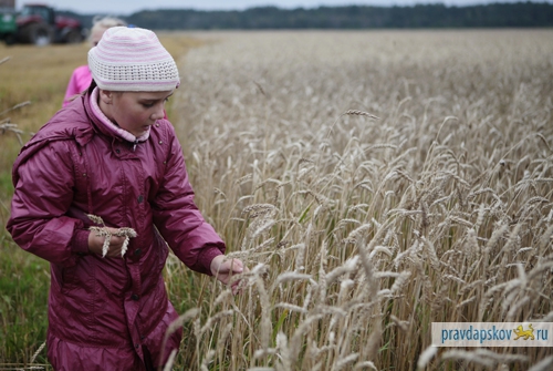 Первая остановка - огромное пшеничное поле у деревни Грибули. Совсем недавно эти поля были заброшены, пока в прошлом году не стали собственностью псковской птицефабрики. Угодья привели в порядок, засеяли 500 га элитной пшеницей и в конце августа уже приступили к уборке своего первого урожая зерна.