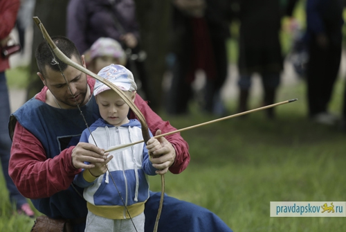 Дружина князя Довмонта показала навыки боевого искусства на площадке перед сценой, а все псковичи, желающие попробовать свои силы в историческом турнире, смогли побороться за звание лучшего на ристалище в лагере реконструкторов.
