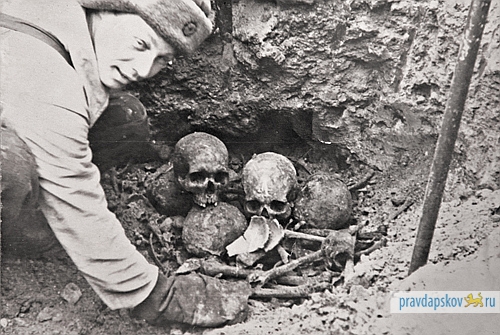 Таким образом выдалбливали квадратные ямы по 4-5 метров глубиной, потом их бетонировали и заливали фундамент. И вот однажды лом неожиданно легко ушел в землю, которая для зимнего времени года оказалась чересчур мягкой. На полуметровой глубине обнаружили целое захоронение, площадью примерно метр на метр.