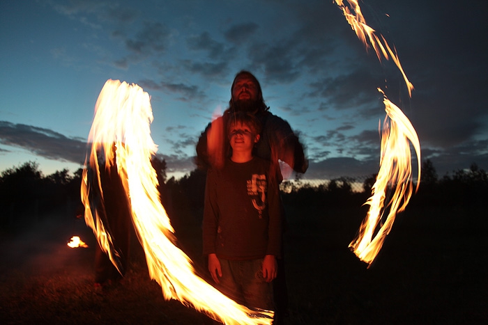 Дав команду развести костер, волонтеры слишком поздно осознали, что в отсутствии контроля за процессом, пошла в ход серьезная часть дровника. Ну ладно, гулять, так гулять. На фоне костра дети вошли в транс и утихли. Погода, закат — все как по заказу. Татьяна, Эдуард и Соня играли на флейте, волынке и бубне, подготавливая аудиторию к главному действу – файер-шоу. Люди из театра огня Ignis Fatuus кроме укрощения этого самого огня проявили феноменальные успехи в покорении еще одной опасной стихии — орущей и расторможенной толпы детей.