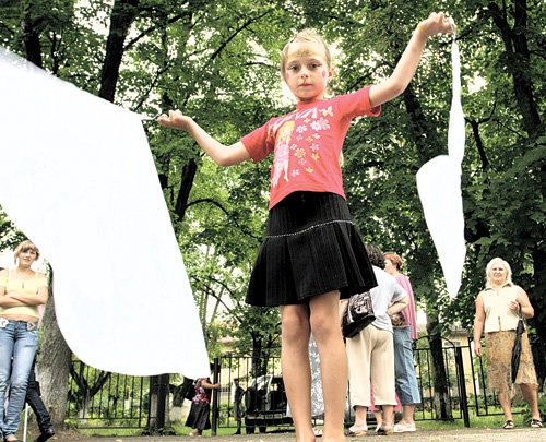Главную лепту в ход акции внес Эдуард. Прежде всего, он устроил то, от чего у проходящих по улице Свободы жителей Печор глаза лезли на лоб – файер-шоу. Густая туча как нельзя кстати задрапировала небо, и потому огонь был прекрасно виден даже днем. Дети со смесью восторга и опаски следили то за вращающимися факелами, то за кистями артиста. Спустя несколько минут ребята сами крутили учебные пои, пытаясь синхронизировать движения. А потом наступил черед музыки.