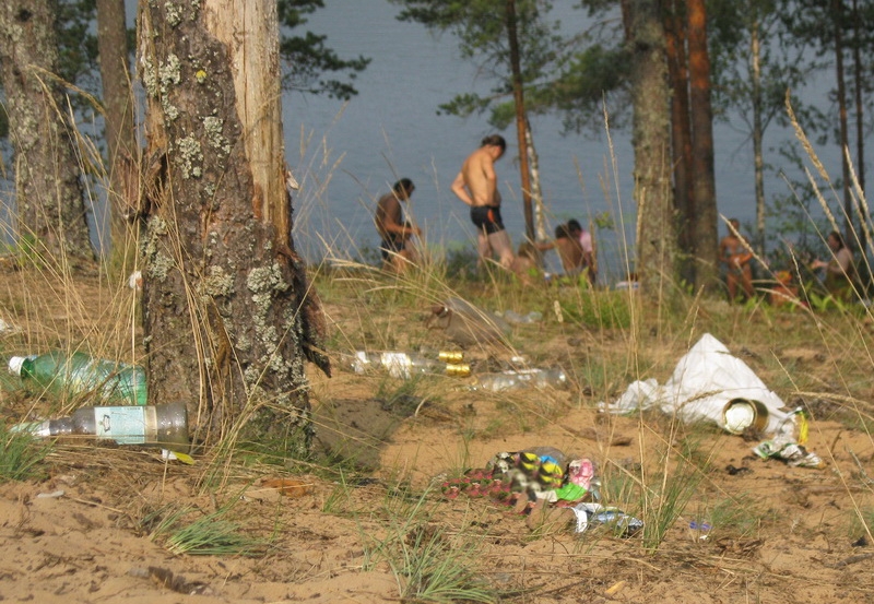 Чтобы найти себе место среди напоминаний о чьих-то пирушках, пришлось немало потрудиться. «Хоть на дерево лезьте», - засмеялся проходящий мимо отдыхающий. Но и деревья доверия не внушали. Люди умудрились завалить, а точнее завесить мусором даже стволы сосен, закрепив на суках банки из под пива. «Это местные фонари!», - заметил тот же весельчак. Отчаявшись, мы устроили свой собственный десант. Взяли пакет, и убрали весь пластик, бумагу и резину в радиусе 10 метров около автомобиля. Загрузив багажник до отказа бытовыми отходами, мы удобно расположились под солнцем. Но уже минут через 5, малыш, пробегая мимо, выкинул фантик от конфеты, крикнув: «Лети, лети никого не зацепи!». Позже, как «привет» от соседней компании, со склона на нас посыпались арбузные корочки. Тщетны оказались наши старания.