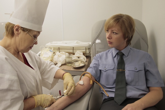 Старший инспектор УГИБДД УВД по Псковской области Юлия Акопян сдает кровь для пострадавших в ДТП.