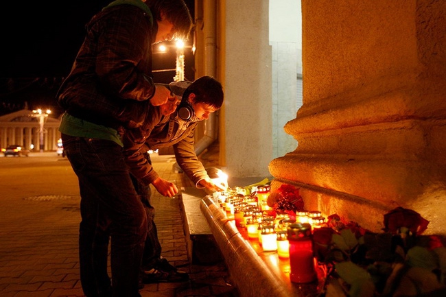 …Народу в автобус набилось, держаться было неудобно, пошевелиться можно было с трудом. Через пару минут ехавшим рядом людям стали звонить. «Да, в метро не пускали с 6 часов, еду на автобусе...», «А что там стряслось?..», «То есть мне повезло...», «Посмотришь новости – позвони мне, расскажи». Одна пожилая женщина рядом, как оказалось, была очевидцем – должна была сесть на «Октябрьской», но когда подошла к метро, оттуда уже выходили окровавленные люди и несли других людей, а рядом стояла женщина, которая все время повторяла слово «эскалатор».