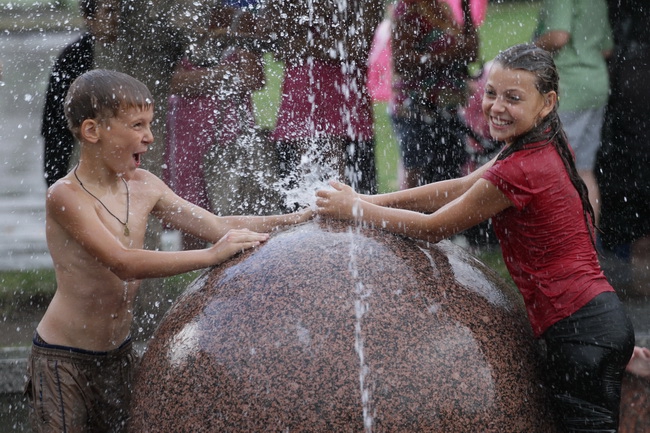 После этого почетные гости перерезали удерживающие шары веревки, что стало сигналом для запуска фонтана. Малыши, до этого чинно стоявшие среди зрителей, от избытка чувств полезли в воду.