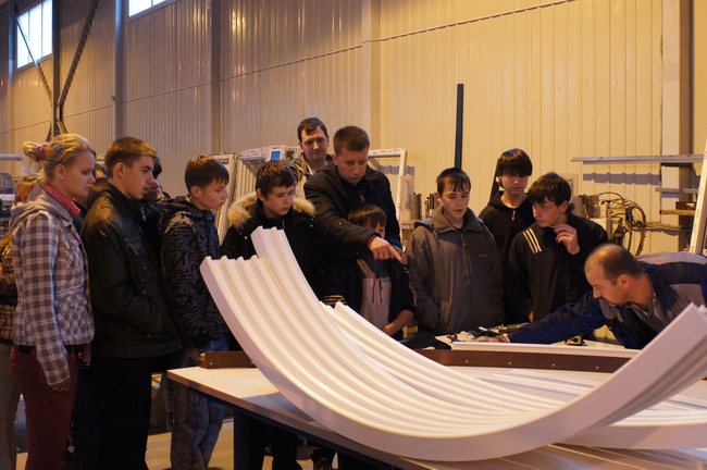 - Сначала дали попробовать вырезать на компьютерном станке фигуры для рамок. Потом мы смотрели, как соединяли профиль в одну большую раму для окна. Потом мы пошли туда, где стекло режут. Его (стекло метра 4 в высоту) валили, но каким-то образом оно вообще не разбивалось! Там ветер шел снизу. На стекло наносится масло, чтобы легче было вырезать. Потом чистится шестью щетками каждый кусок. Несколько слоев стекла накладывают – нам показали почти готовое окно. А потом мазутом обмазывают края.