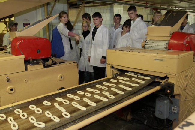 В цехе, где делают хлеб «кирпичиком», дети завороженно наблюдали, как перемешивается тесто, а потом долго смотрели, как работает машина для нанесения масла на формы для выпечки хлеба, куда тут же закладывалось тесто. Далее хлеб пекся, остывал и по очень большому конвейеру попадал в следующий цех для упаковки. Упаковывала хлеб также машина, люди только раскладывали его по ящикам.