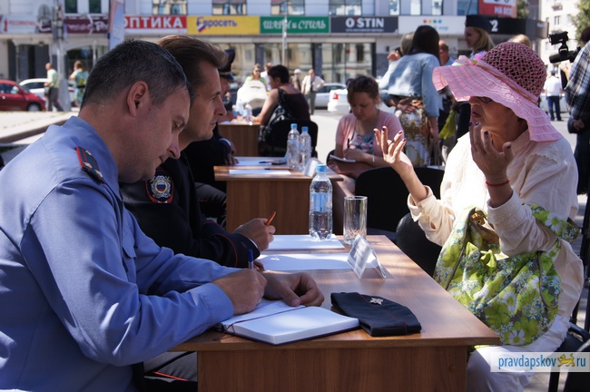 Часто ли можно на улице вот так вот запросто встретиться и поговорить с начальником областной ГАИ? А с главой полиции города? Тем, кто солнечным днем 3 июля оказался на Октябрьской площади, несказанно повезло – два часа подряд за пятью столами с горожанами общались те, от кого зависит безопасность на дорогах Пскова.