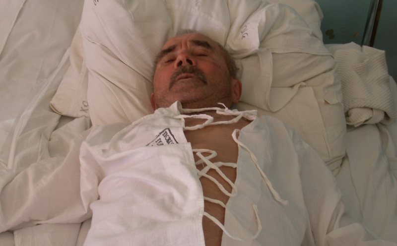 Мы общались с Виктором Тимофеевым в хирургическом отделении городской больницы. Виктор Михайлович лежал под капельницей. Его сын Дмитрий сказал, что отца трудно узнать. Разбитое лицо (повреждение под правым глазом, расцарапанная левая щека), ушиб за правым ухом, выше левой лопатки огромный синяк, сломанный палец на правой руке… Высокое давление, жалобы на боль в животе и груди…