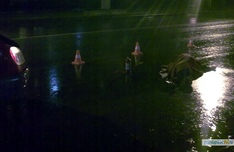 Прибывшие сотрудники ДПС УВД Пскова огородили место происшествия аварийными конусами. Отметим, что около 20.30 одна из легковых машин чуть не наехала на лежащий на дороге труп мужчины, задев аварийный конус и протащив его по дороге.