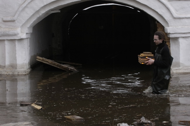 - Я уже двое суток не сплю. В субботу и воскресенье вода в монастыре до плечей доходила, поэтому волонтеров отправляли в собор, потому что спецодежды не хватало, - вспоминает отец Афанасий, служитель Мирожского монастыря. - Сегодня вода сошла, правда, держится там, где есть керамическая плитка, в некоторых местах открыт пол, полностью выдраны половицы. Слава Богу, люди помогают, замгубернатора Максим Жаворонков к нам приезжал, обещал помочь всем, чем надо, «Псковполимер» предоставил резиновые сапоги, в 76-й дивизии части нам готовят продукты.