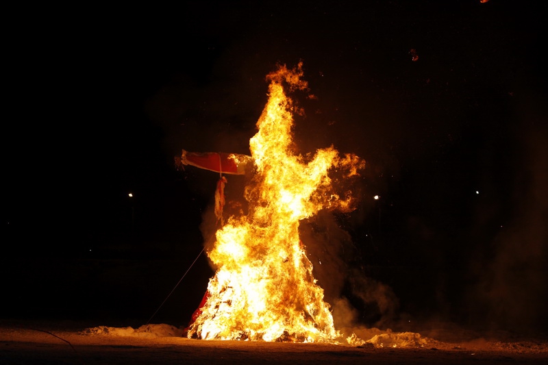 Темп главной российской масленицы ощутимо ускорялся с наступлением сумерек. Всё-таки при дневном свете ощущалась некоторая скованность приезжего люда (большей частью – питерских и московских), а вот с приближением темноты началось настоящее веселье. На высоченный голый столб норовили залезть уже все, кому не лень. Борьба за многочисленные призы в конкурсах приняла ажиотажный характер, выросли ставки на благотворительном аукционе, где народ бойко торговался за свежеиспечённые блины (начинались торги всякий раз с цены в один рубль).
