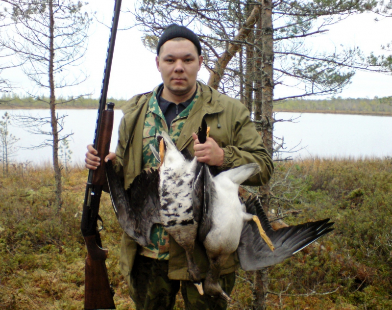 С гусем посложнее, так как эта охота сложная, требует определенных навыков, меткости. Сложность заключается в том, что нужно угадать, где пролетит гусь. Год от года места миграции меняются. Часто гусь летит над маленькими водоемами, пахотами, любит садиться на открытой местности, небольших болотах благодаря хорошей видимости. Лучшая охота – туманный день, осенью. При плохой видимости гусь летит очень низко. Большое значение имеет качественное, хорошее ружье. Для гуся – одноствольное ружье с резким кучным боем, дальнобойное. Или ружья со сменными чековыми сужениями, которые позволяют стрелять на разные дистанции.