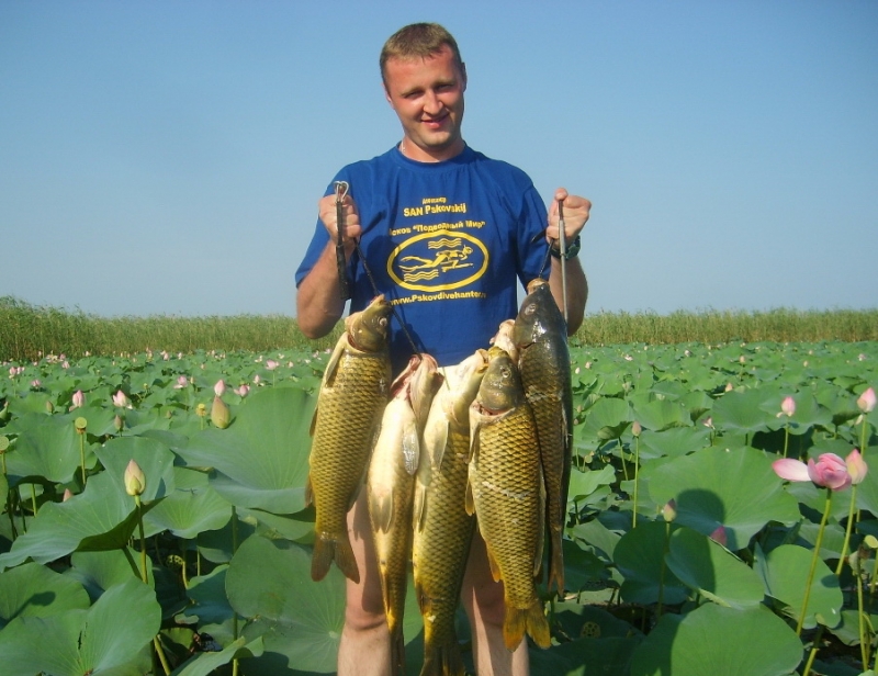 Рыбы на «раскатах» много, там, где мы охотились, встречались сазан, щука, сом. Поразила красноперка – необычайно яркой раскраской и размерами далеко за килограмм. Самый крупный трофей (сом весом 13 кг) добыл Александр_???, самого большого 10- килограммового сазана выследил и подстрелил председатель нашего клуба Олег Довгий. Впечатлили лотосы – такую красоту на воде я видел впервые.