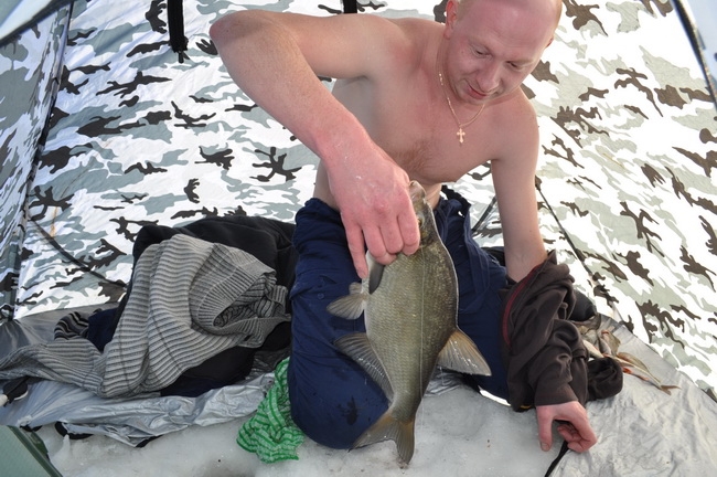 Мой помощник держал леску в натяг, а я быстро, по-армейски, снял многочисленные одежды, просунул руку в лунку, для чего пришлось лечь, так как лед этой зимой почти метровой толщины. Нащупав рыбину, я схватил ее за жабры и с серьезным усилием протащил наверх. Радости не было предела. Ведь у меня небольшой опыт зимней рыбалки и такого красавца-леща удалось поймать впервые!
