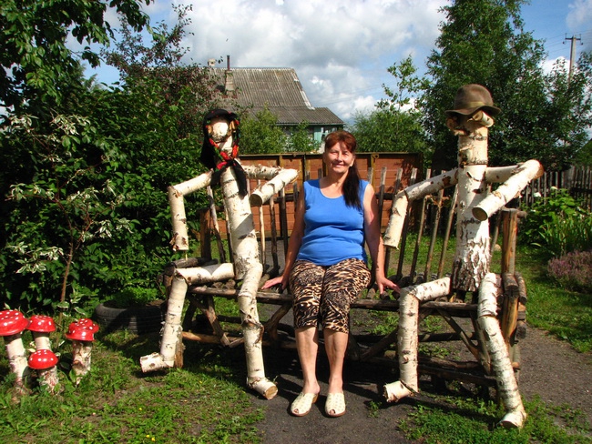 Много красивых подворий в Залесье. Но участок вокруг дома Сараповых выделяется своеобразием, оригинальностью и …теплотой. Среди ухоженных грядок и цветников весело разместились грибочки с красными шляпками самого разного калибра, два козлика и старик со старухой. А основой всех поделок послужила наша русская белоснежная березка.