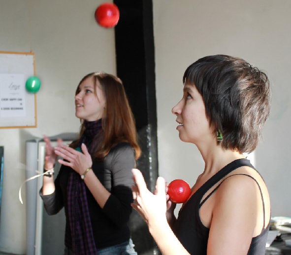 15 октября, суббота. Из двери просторного помещения бывшего цеха галантерейно-футлярной фабрики, ныне - творческого объединения «Завод», под ноги вылетает яркий мячик. Доносятся наставления: «Не бойтесь ронять шарики, они не разобьются!», «Доводите движения до автоматизма, как зубы по утрам чистите!», «Телом не дёргайте, работают только руки и взгляд!».