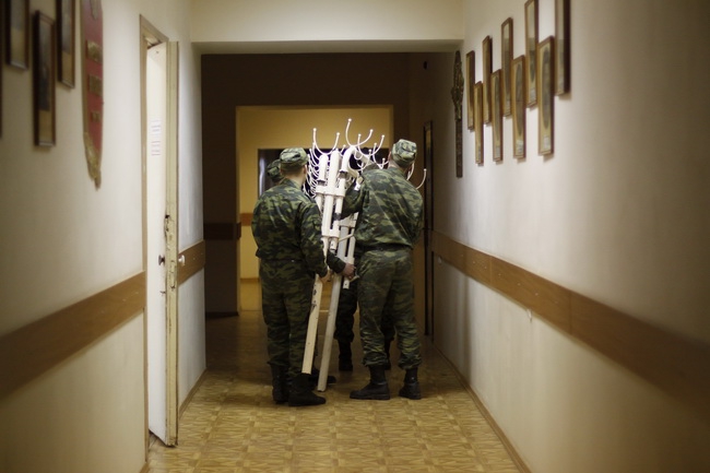 «Люди подневольные» сидели в холле и смотрели, как солдаты выносят вешалки. На наш вопрос военным, куда все-таки увозят имущество, стоявший около машины офицер процедил сквозь зубы, что они сами не знают. Вешалок было много, по виду тяжелые. Сотрудники только просили военных, чтобы они не поцарапали пол или стены.