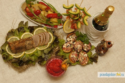 Рискуя вызвать непонимание и досаду, я не буду сегодня готовить салаты в виде елок, шишек, лошадей и т.д., не расскажу оригинальный рецепт «Оливье» или «Шубы». Могу только обещать, что все будет очень вкусно. Итак, сегодня готовим брускетту с сыром фета и мексиканские шашлычки с креветками на закуску, ростбиф с запеченными овощами – в качестве основного блюда, а на десерт – сорбэ из апельсина и малины.