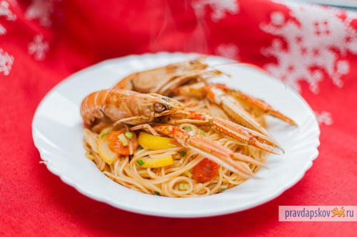 Спагетти отварите в подсоленной воде до состояния «аль денте» (когда внутри спагетти остаются слегка твердыми), откиньте на дуршлаг и переложите в сковороду с лангустинами.