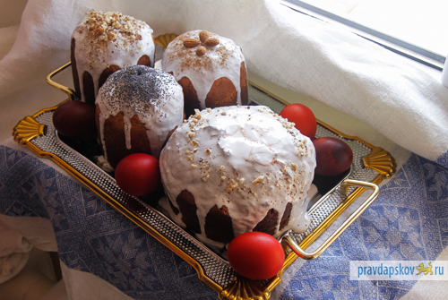 Верх готового кулича покройте сахарной глазурью. Для этого взбейте 1 яичный белок с 200 г сахарной пудры, добавьте несколько капель лимонного сока. Вылейте глазурь на полностью остывший кулич, посыпьте орешками, шоколадными или цветными шариками и оставьте для застывания.